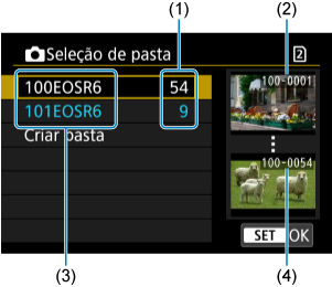 - Uma pasta pode conter um máximo de 9999 imagens (número de ficheiro 0001-9999). Quando uma pasta ficar cheia, uma nova pasta cujo número atribuído está uma unidade acima do anterior é criada automaticamente. Além disso, se executar um reinício manual (), uma nova pasta é criada automaticamente. Podem ser criadas pastas com números de 100 a 999.