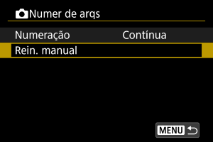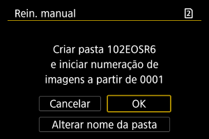 Quando reinicia manualmente a numeração de ficheiros, é criada uma nova pasta automaticamente e a numeração de ficheiros de imagens guardadas nessa pasta começa a partir de 0001.