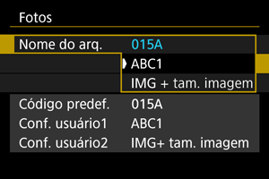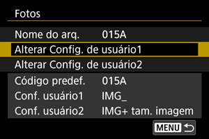 A definição do utilizador 1 permite registar quatro carateres à sua escolha. A Definição do utilizador 2 adiciona três carateres iniciais registados à sua escolha a um quarto caráter que representa o tamanho de imagem que é adicionado automaticamente depois de fotografar.