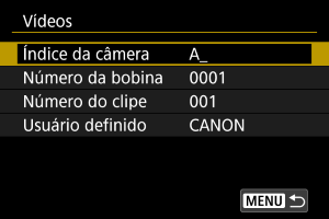 Um número de 3 dígitos de 001 a 999 precedido por C, como em C001–C999. Depois de C999, D é usado no início. Atribuído automaticamente a cada clipe (ficheiro de vídeo). Pode definir o valor predefinido. |
