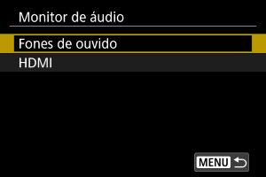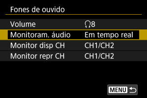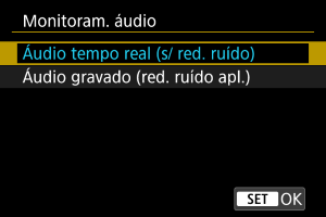 Pode escolher o áudio durante a gravação do vídeo que é utilizado para a saída de auscultadores. Para reduzir o ruído na gravação de áudio, configure [Reduç. ruído áudio] ().