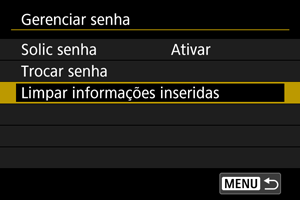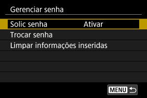 Utilize estas definições para gerir a palavra-passe introduzida quando o interruptor de alimentação estiver definido para ou a câmara retomar o funcionamento após ter desligado automaticamente. Para obter instruções sobre como definir a palavra-passe necessária no arranque da câmara, consulte Definir uma palavra-passe.