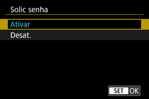 Pode escolher entre introduzir uma palavra-passe depois de o interruptor de alimentação ser colocado em ou quando a câmara retoma o funcionamento depois do desligamento automático.