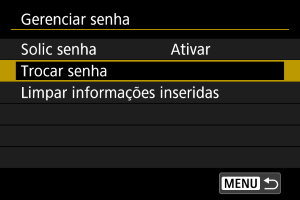 Pode alterar a palavra-passe quando o interruptor de alimentação é colocado em ou quando a câmara retoma o funcionamento depois do desligamento automático.