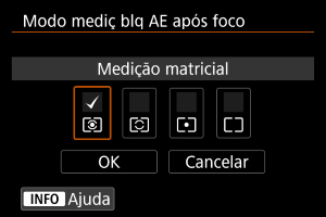 Para cada modo de medição, pode especificar se pretende bloquear a exposição (bloqueio AE) quando os motivos estiverem focados com One-Shot AF. A exposição fica bloqueada enquanto carregar no botão disparador até meio sem soltar. Selecione modos de medição para bloqueio AE e adicione uma marca de seleção []. Selecione [OK] para registar a definição.