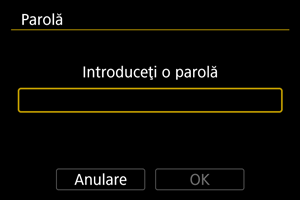 Puteţi modifica parola pe care trebuie să o introduceţi când butonul de alimentare este setat la sau când camera reia operarea din închiderea automată.
