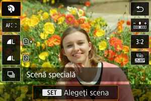 • Când [Setare: Indicaţii moduri] este setat la [Dezactivare], după pasul 1, apăsaţi butonul Comandă rapidă/Set pentru a accesa ecranul de Comandă rapidă, folosiţi rotiţa Rotiţă principală pentru a selecta un mod de înregistrare, apoi apăsaţi butonul Comandă rapidă/Set.