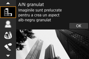 - Cu [A/N granulat], previzualizarea granulată va fi diferită faţă de fotografia finală.