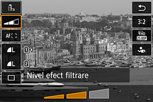 - În modurile din Zona Creativă, anumite setări pentru filtre sunt disponibile din ecranul pentru Comandă rapidă ().