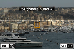 Puteţi muta zona care este clară (cadrul scenei) aşa cum este descris la Reglare efect de miniatură. [AF 1 punct] este folosit ca zonă AF. Este recomandată înregistrarea cu punctul AF şi cadrul scenei aliniate.