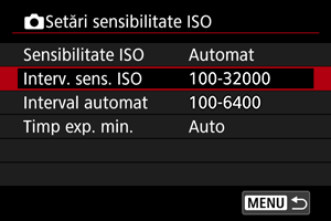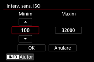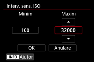 Puteţi seta intervalul de setare pentru ISO manual (limitele minime şi maxime). Puteţi seta limita minimă în intervalul ISO 100 - ISO 32000 şi limita maximă în intervalul ISO 200 - H (echivalent ISO 51200).
