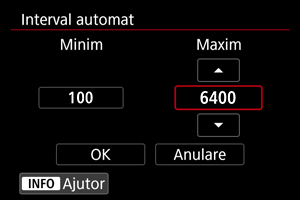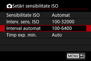 Puteţi seta intervalul ISO pentru Auto ISO în intervalul ISO 100–32000. Puteţi seta minimul în intervalul ISO 100–25600 şi maximul în intervalul ISO 200–32000, în paşi de 1-stop.