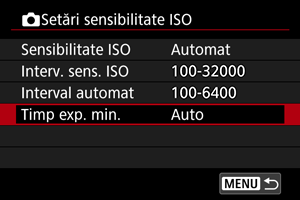 Pentru a preveni setarea automată a unui timp ce expunere prea lung, puteţi seta timpul de expunere minim pentru ISO auto.