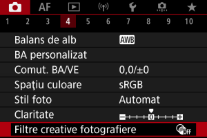 - Aparatul fotografiază în modul un cadru când este setat un filtru creativ, indiferent de setarea pentru modul de declanşare (