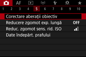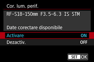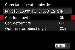 - Atunci când folosiţi un alt obiectiv decât Canon, este recomandată setarea corectării pe [Dezactivare], chiar dacă opţiunea [Date corectare disponibile] este afişată.