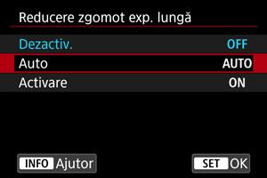 Reducerea zgomotului va fi realizată pentru toate expunerile de 1 secundă sau mai lungi. Setarea [Activare] poate reduce zgomotul care nu poate fi detectat de setarea [Auto].
