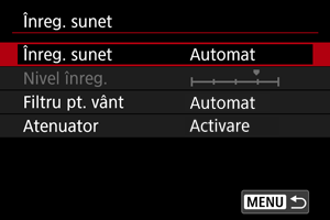 : Înreg. sunet] vor fi [Activare] şi [Dezactivare]. Setaţi la [Activare] pentru reglarea automată a nivelului de înregistrare.