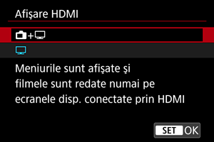 ]. Meniurile aparatului şi redarea imagini sunt afişate doar pe ecranul conectat prin HDMI.