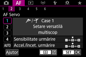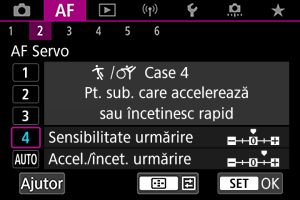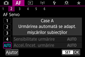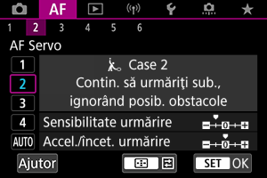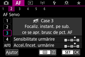 Fotografierea cu AF Servo poate fi personalizată uşor subiectului sau situaţiei de fotografiere prin selectarea unei opţiuni pentru Caz. Această funcţie este denumită “Unealtă configurare AF.”