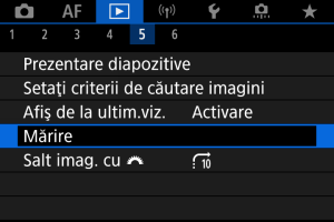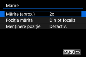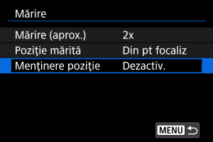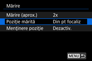 Puteţi specifica dacă să păstraţi aceeaşi poziţie pentru vizualizare mărită sau să folosiţi poziţia setată în [Poziţie mărită] când afişaţi următoarele imagini.