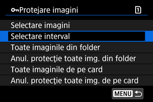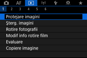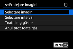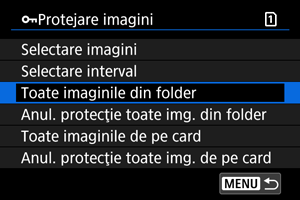 - Pentru a anula protejarea imaginii, selectaţi [Anul. protecţie toate img. din folder] sau [Anul. protecţie toate img. de pe card].