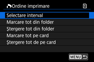 Dacă selectaţi [Marcare tot pe card], câte o copie a tuturor imaginilor de pe card va fi specificată pentru imprimare.