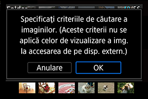 • Condiţiile de căutare pot fi anulate după operaţiuni care implică oprirea aparatului sau modificări pe card şi editarea, adăugarea sau ştergerea unor imagini.