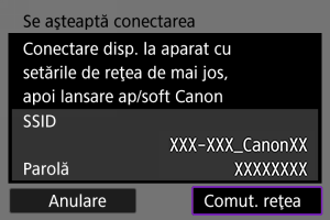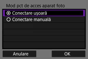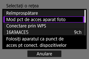 - Pentru [Mod pct de acces aparat foto] afişat la pasul 5, consultaţi Mod punct de acces aparat.