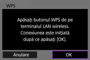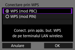 Această secţiune descrie cum să stabiliţi o conexiune Wi-Fi folosind un punct de acces compatibil cu WPS (mod PBC).