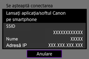 Conectare la smartphone]. Dacă este deja instalat Camera Connect, selectaţi [Fără afişare].