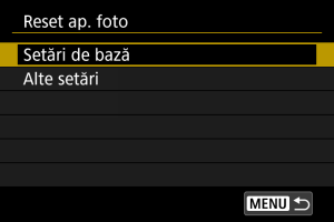 Setările funcţiilor de fotografiere ale aparatului şi setările de meniu pot fi aduse la valorile implicite.