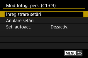 Dacă selectaţi [Anulare setări] la pasul 2, setările pentru fiecare mod pot reveni la setările implicite, aşa cum au fost înainte de înregistrare.