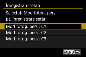 - Selectaţi modul de fotografiere Personalizat la care să înregistraţi, apoi selectaţi [OK] pe ecranul [Înregistrare setări].