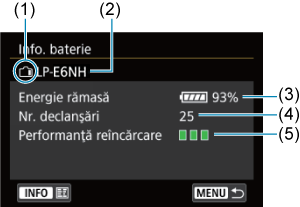 - Puteţi să verificaţi capacitatea rămasă a bateriei respective (2) şi data când a fost folosită ultima oară (3).