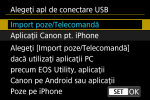 Selectaţi dacă folosiţi EOS Utility după conectarea la un calculator sau dacă veţi folosi aplicaţia Android dedicată sau versiunea iOS pentru Photos.