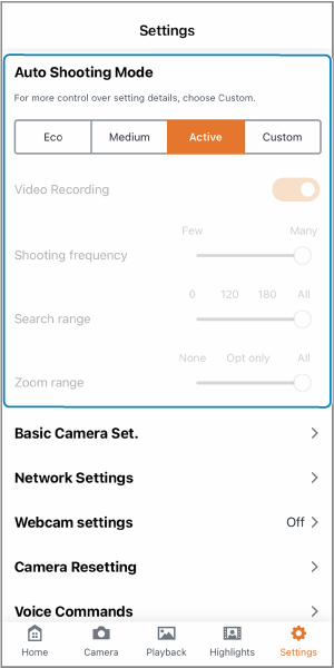 - Pentru a economisi energie, setaţi articolul [Auto Shooting Mode] (Mod fotografiere automată) la [Eco] sau [Medium] (Mediu).