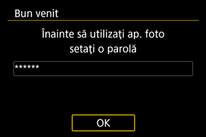 Puteţi modifica parola pe care trebuie să o introduceţi când butonul de alimentare este setat la sau când camera reia operarea din închiderea automată.