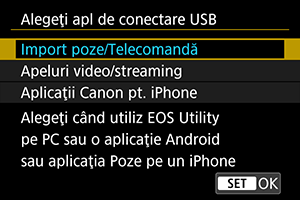 Selectaţi dacă folosiţi EOS Utility după conectarea la un calculator sau dacă veţi folosi aplicaţia Android dedicată sau versiunea iOS pentru Photos.