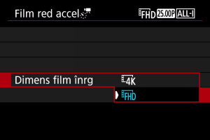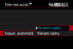 ]) este afişat cu roşu dacă setarea [Nr. cadre] va avea ca rezultat un fişier film care depăşeşte 4 GB şi cardul nu este formatat eXFAT (). Dacă veţi continua să înregistraţi în aceste condiţii şi dimensiunea fişierului film ajunge la 4 GB, înregistrarea filmului cu redare accelerată se va opri.