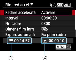- Chiar dacă timpul de redare al filmului cu redare accelerată este mai mic de 1 sec., tot va fi creat un film. În acest caz, “00'00"” este indicat în [Timp redare].