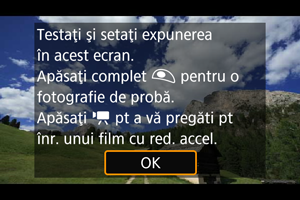 - La fel ca la fotografiere, setaţi expunerea şi funcţiile fotografierii, apoi apăsaţi butonul declanşator până la jumătate pentru a focaliza.