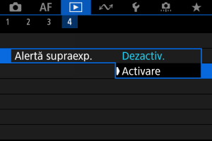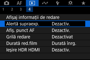 Puteţi specifica dacă să clipească afişajul în zonele supraexpuse pe ecranul de redare. Pentru a obţine mai multe detalii în imagini în zonele care clipesc unde doriţi să fie reprodusă mai bine gradaţia, setaţi compensarea expunerii la o valoare negativă şi înregistraţi din nou pentru un rezultat mai bun.