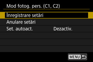 Dacă selectaţi [Anulare setări] la pasul 2, setările pentru fiecare mod pot reveni la setările implicite, aşa cum au fost înainte de înregistrare.