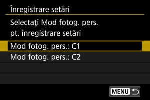 - Selectaţi modul de fotografiere Personalizat la care să înregistraţi, apoi selectaţi [OK] pe ecranul [Înregistrare setări].