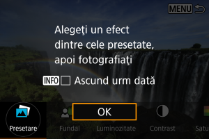 Pentru a salva setările actuale în aparat, apăsaţi butonul pe ecranul de setare [Asistenţă creativă], apoi selectaţi [OK]. Pot fi salvate maxim trei presetări ca [USER*]. După ce salvaţi trei presetări, trebuie să suprascrieţi o presetare [USER*] existentă pentru a salva una nouă.
