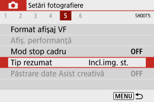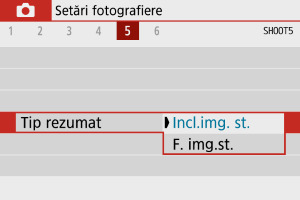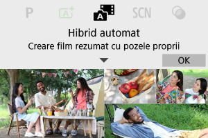 Sunt înregistrate atât fotografii, cât şi clipuri când fotografiaţi în modul [], dar puteţi specifica dacă să includeţi şi fotografia în filmul rezumat rezultat.