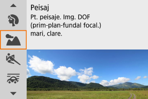 Folosiţi modul [] (Peisaj) pentru un cadru mai larg, pentru a putea focaliza oriunde, de la subiectul cel mai apropiat la subiectul cel mai depărtat. Pentru imagini cu nuanţe intense de albastru şi verde şi pentru imagini foarte clare.