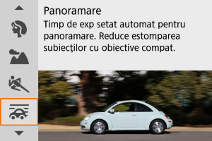 - Timpii de expunere sunt mai lungi. De aceea, modul Panoramare nu este potrivit decât atunci când panoramaţi în timp ce fotografiaţi.