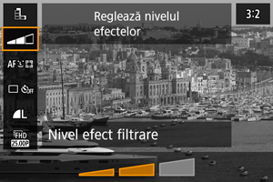 - În modurile din Zona Creativă, anumite setări pentru filtre sunt disponibile din ecranul pentru Comandă rapidă.