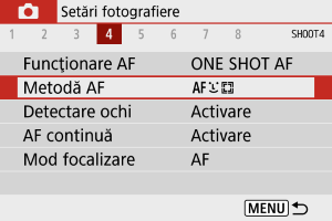- Fără a folosi meniul, puteţi seta metoda AF dacă apăsaţi butonul